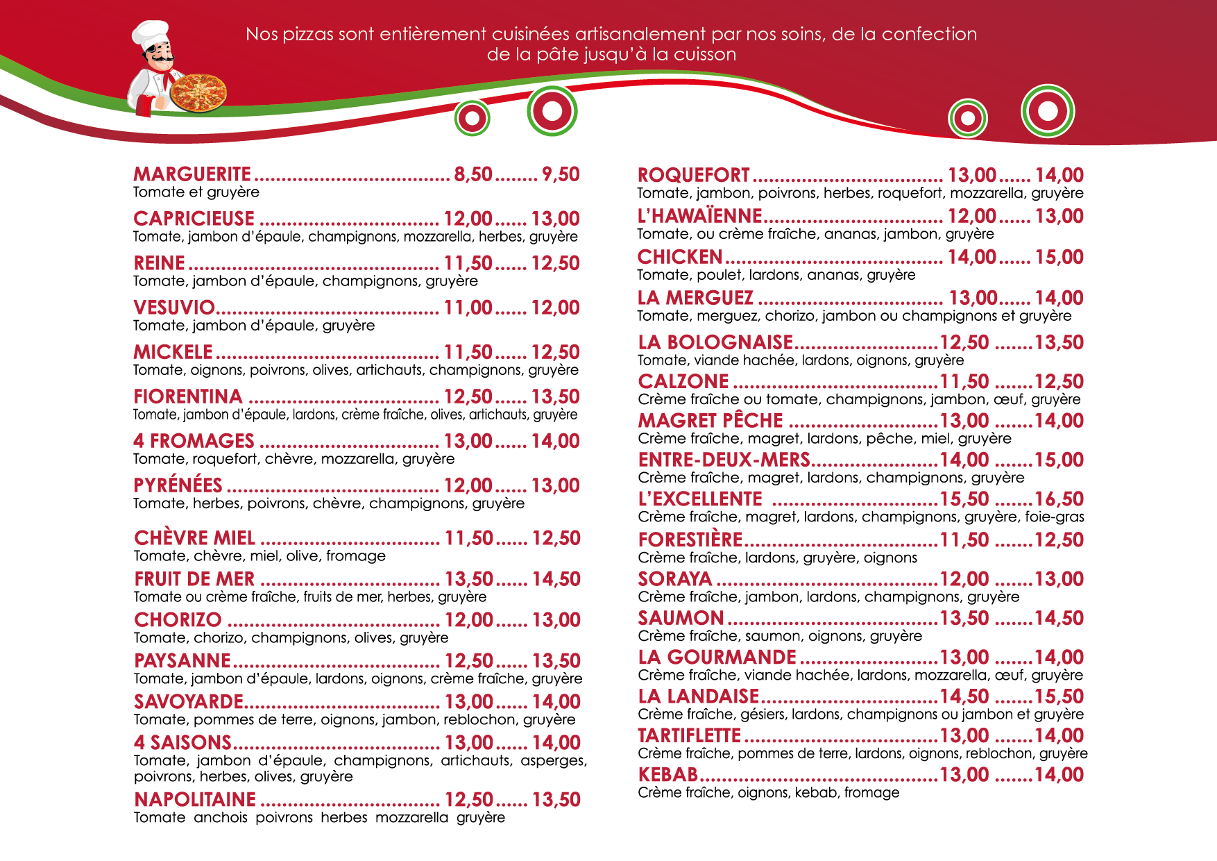 Nous vous proposons des pizzas classiques telles que La Margherita, La 4 Fromages, La Reine, La Calzone mais également La Fiorentina, La Bolognaise, La Saumon et bien d’autres pour vous régaler.